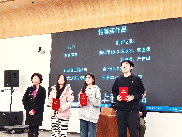 在中英双语主持人简要介绍活动背景与流程之后,典礼进入短视频展播与颁奖环节。特等奖、一等奖、二等奖、三等奖及单项奖依次揭晓,获奖团队依次上台领奖并发表感言。本届典礼还设置了“旅游日语短视频特殊贡献奖”表彰、特邀嘉宾表演《上海之根·都市之韵》、“穿越次元的旅行”数字人讲述旅游英语教学团队成长足迹等环节,全方位呈现了我校在外语教学、文化传承与技术创新方面的综合实力。