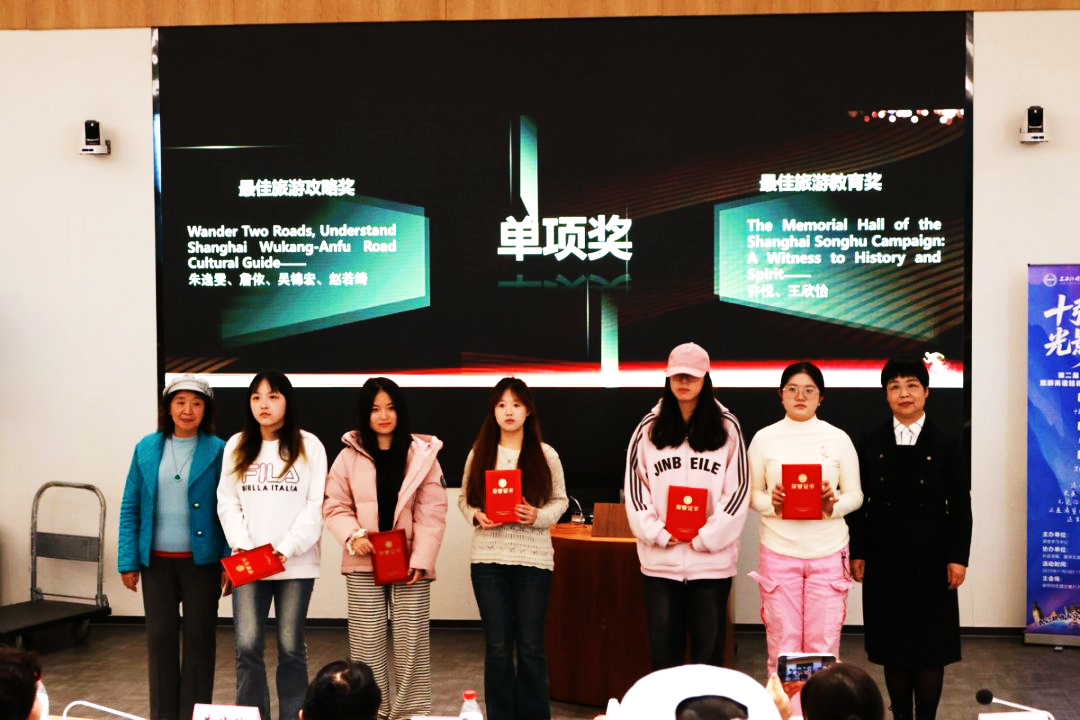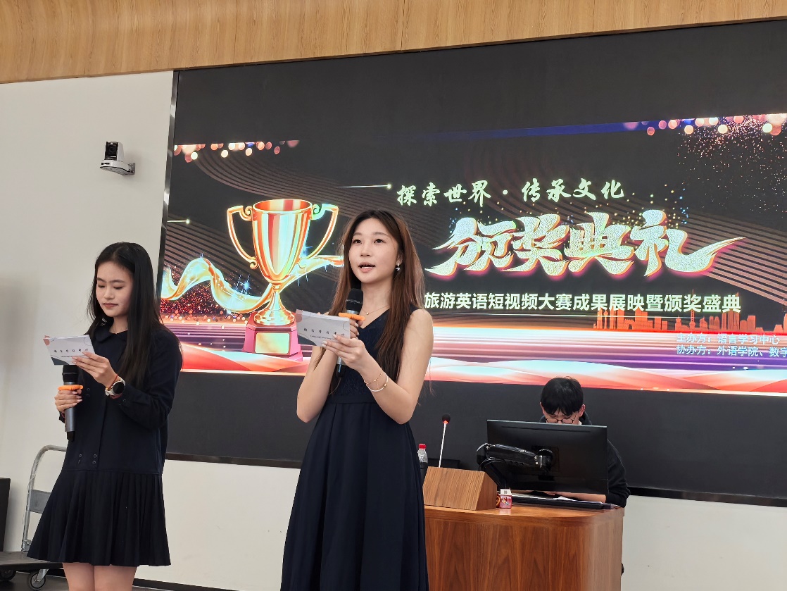 2025年11月26日,由语言学习中心主办,外语学院、数字文旅学院协办的第二届大学生旅游英语短视频大赛颁奖典礼在我校崇明校区国交312大师讲堂隆重举行。本次活动以“探索世界,传承文化”为主题,集中展示了我校学子在英语表达、文化理解与视频创作方面的卓越才华,呈现了一场融学术性、艺术性与国际性于一体的视听盛宴。