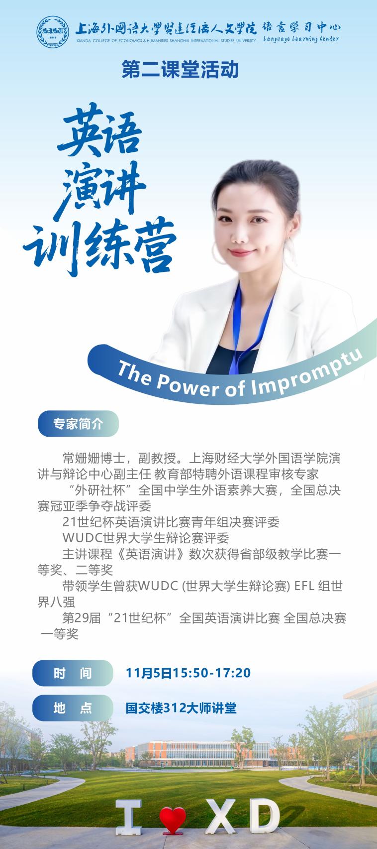 11月5日,英语演讲训练营专家演讲专场活动一场在国交楼312大师讲堂精彩举行。本活动特邀上海财经大学外国语学院副教授、演讲与辩论专家常姗姗博士担任主讲,以“The Power of Impromptu”(即兴演讲的力量)为主题,通过系统方法与实战技巧,助力学生突破表达瓶颈,提升即兴演讲能力与跨文化沟通自信。