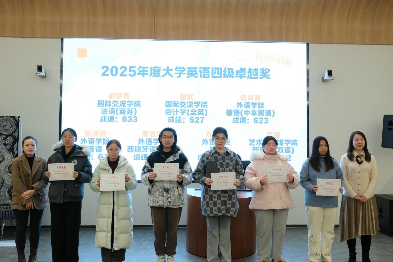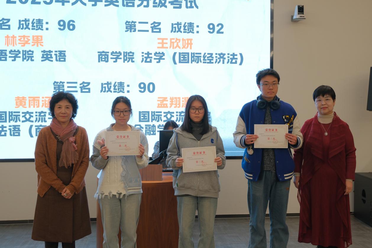根据大学英语分级成绩,前三名的同学分获“2025年大学英语分级考试一、二、三等奖”,语言学习中心朱晓映主任、王哲副主任为获奖同学颁奖。