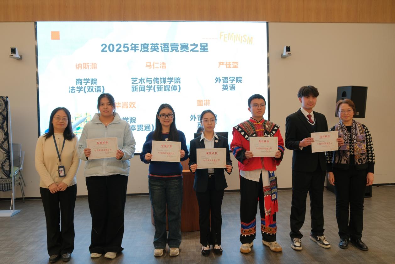 本年度超百年学生积极参与英语竞赛,商学院法学(双语)专业的纳斯瀚、艺术与传媒学院新闻学(新媒体)专业的马仁浩、会计学(中本贯通)专业的毕嵩欢、外语学院英语专业的严佳莹、童淋5名同学获得“2025年度英语竞赛之星”奖项,教务处陶洁副处长及外语学院赵晓临院长为获奖同学颁奖。