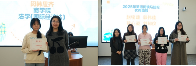 来自商学院法学(国际经济法)专业的闵韩思齐同学获得“2025年英语阅读马拉松最佳表现奖”,并分享了她参加活动时的点点滴滴。赵铭婕、郭伟佳、蔡心凝、刘知仪四位同学在该活动中获得“2025年英语阅读马拉松优秀助教”,刘君玲老师及选修英语教研部主任袁琳子老师获奖同学颁奖。